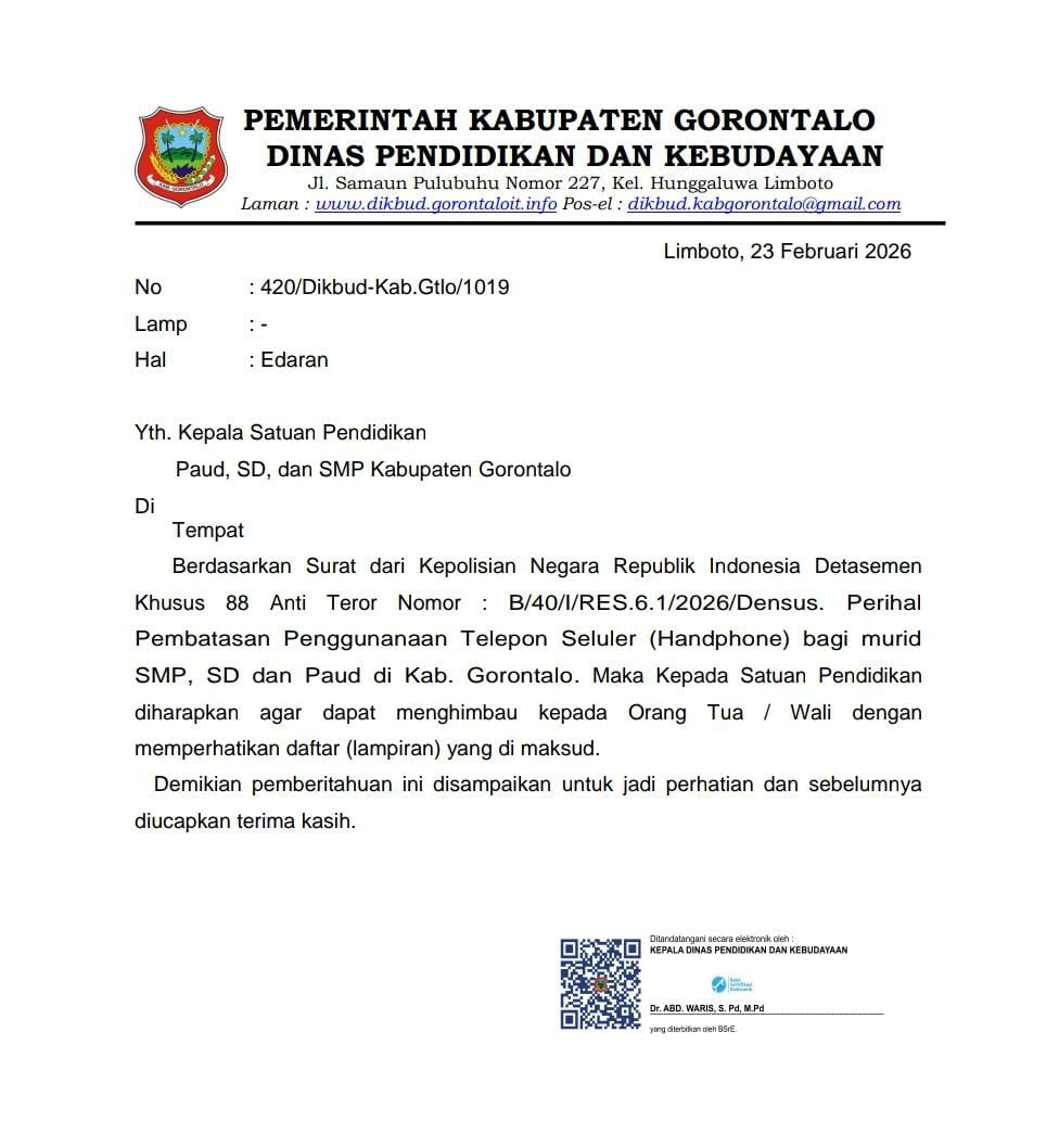 Dalam surat yang sama, Disdikbud Kabupaten Gorontalo juga mengajak orang tua memperkuat pengawasan digital di rumah.