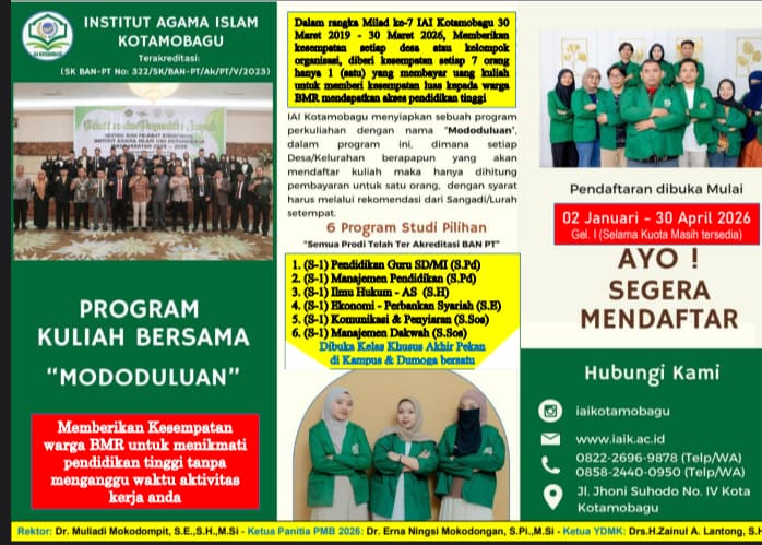 HARIANTIMUR.ID, Kotamobagu — Institut Agama Islam Kotamobagu (IAIK) menghadirkan terobosan pendidikan bagi masyarakat Bolaang Mongondow Raya (BMR) melalui program Kuliah Bersama Mododuluan yang menyasar mahasiswa baru tahun akademik 2026.