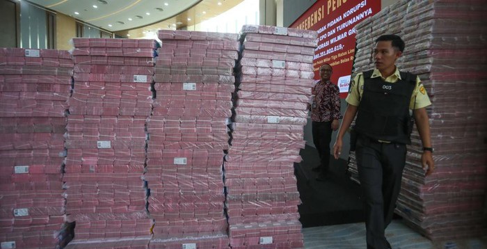 Dalam konferensi pers, tumpukan uang tunai dipamerkan dalam plastik bening. Deretan uang menggunung itu memenuhi ruangan, memperlihatkan skala kerugian negara yang sangat masif dari kasus ini.